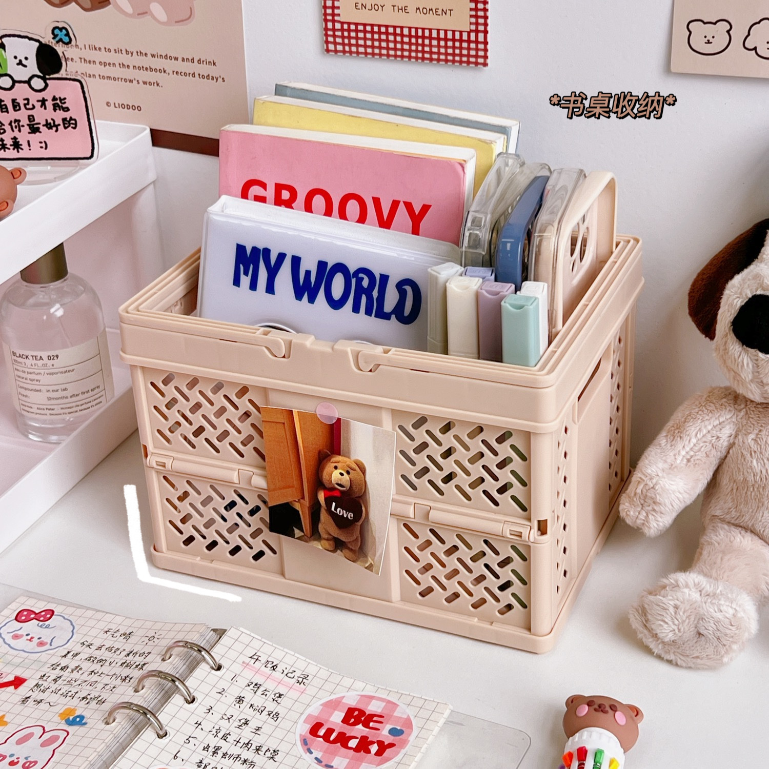 Compact foldable box for desktop storage, ideal for stationery, cosmetics, jewelry, skincare—functional and cute organizer.